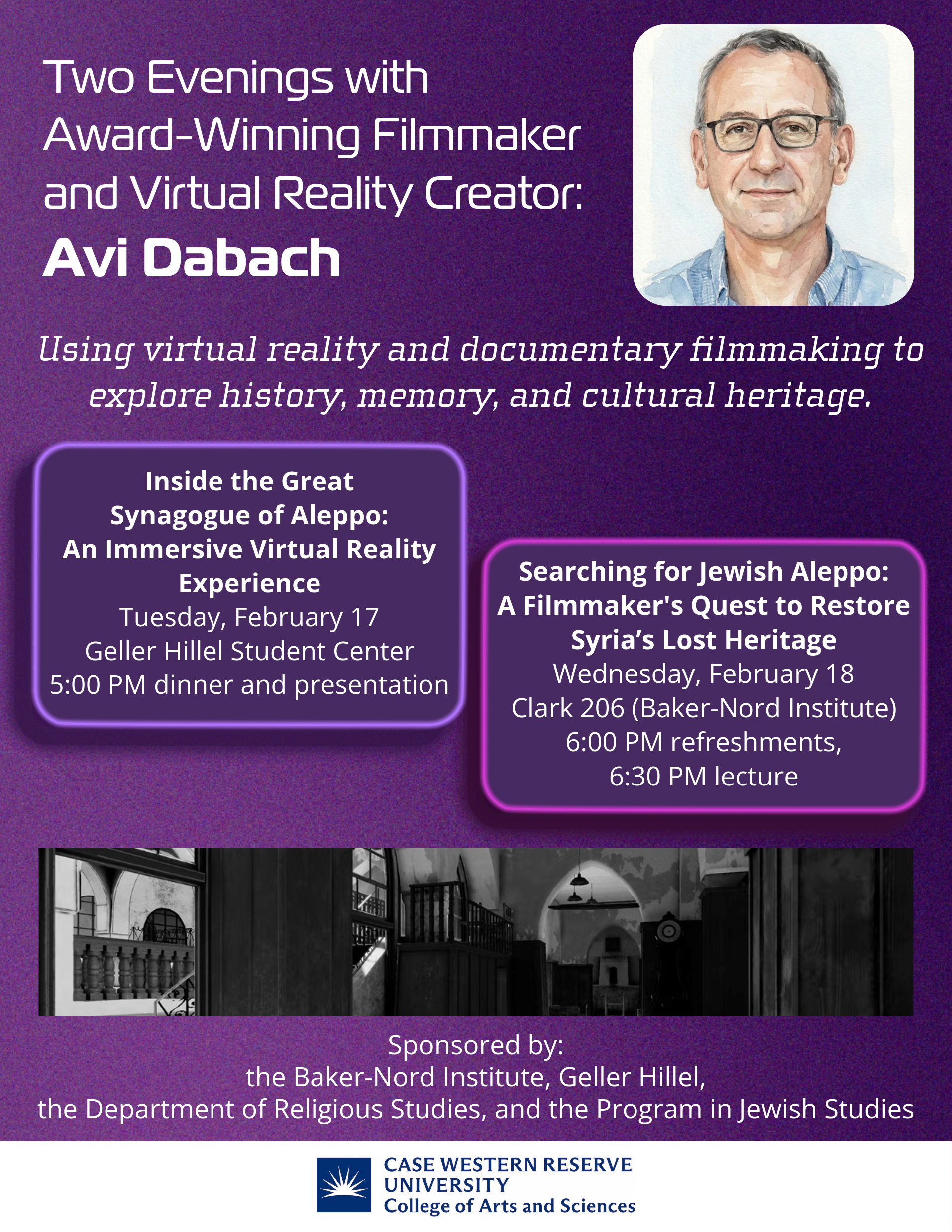 The Department of Religious Studies and the Program in Jewish Studies are proud to welcome award-winning filmmaker and virtual reality creator, Avi Dabach, to our campus for two exciting events! Through an immersive virtual reality workshop and a lecture, Dabach will showcase his use of virtual reality and documentary filmmaking to explore history, memory, and cultural heritage.